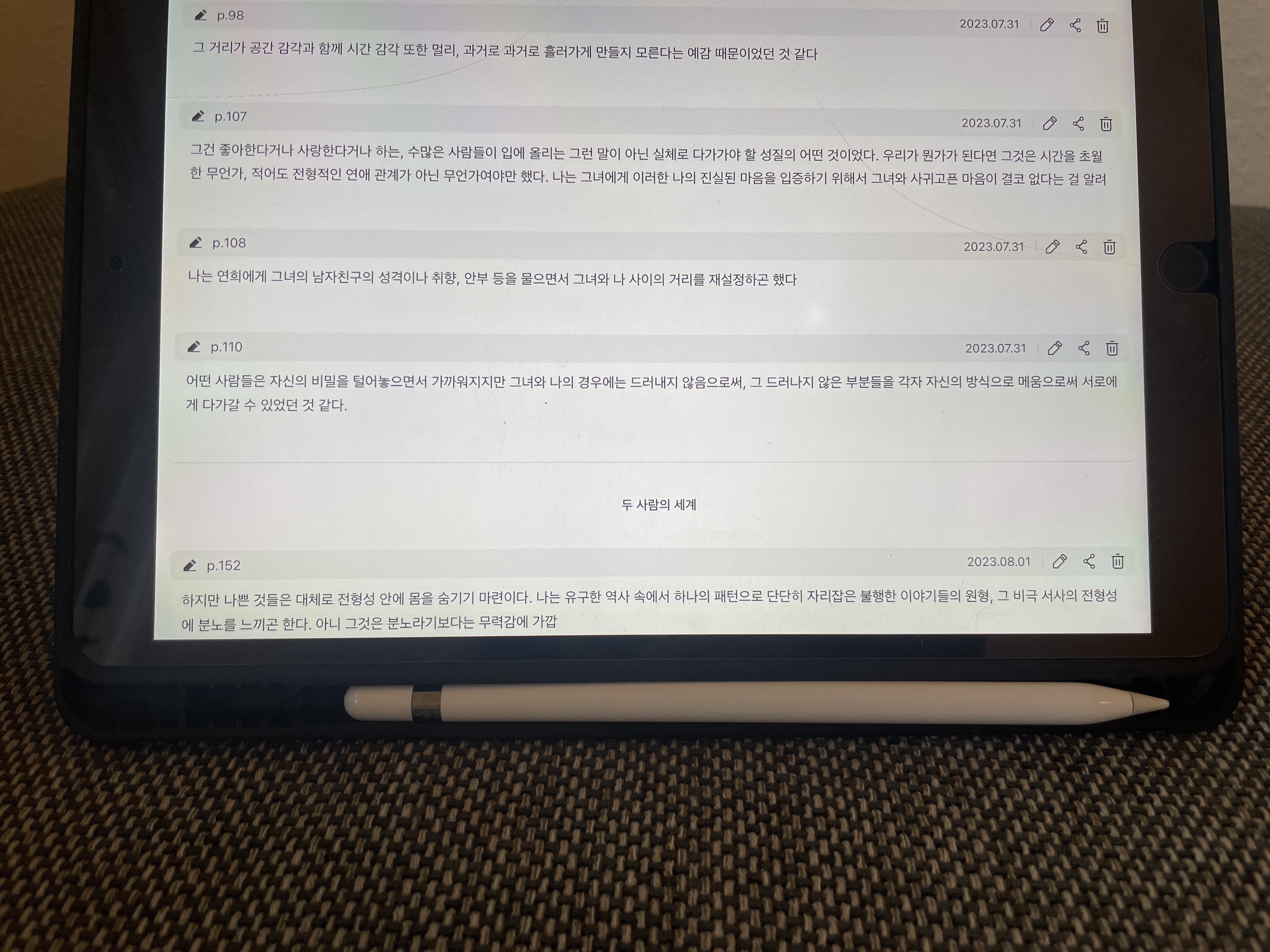 읽을 사람이 아무도 없는 글을 쓰는 일이 생각보다 고독하다는 그의 고백은, 관계가 끝난 뒤에도 여전히 누군가의 목격을 필요로 하는 마음을 드러낸다. 사랑이 끝나도 관객은 필요하다. 그러다 문득 “내가 영원히 혼자일지도 모른다”는 생각이 공포처럼 치고 들어오는 순간, 소설은 연애담을 넘어 현대적인 존재론의 불안을 건드린다. 관계는 끝나고, 남는 것은 나의 언어인데, 그 언어가 닿을 타자가 없을지도 모른다는 두려움.