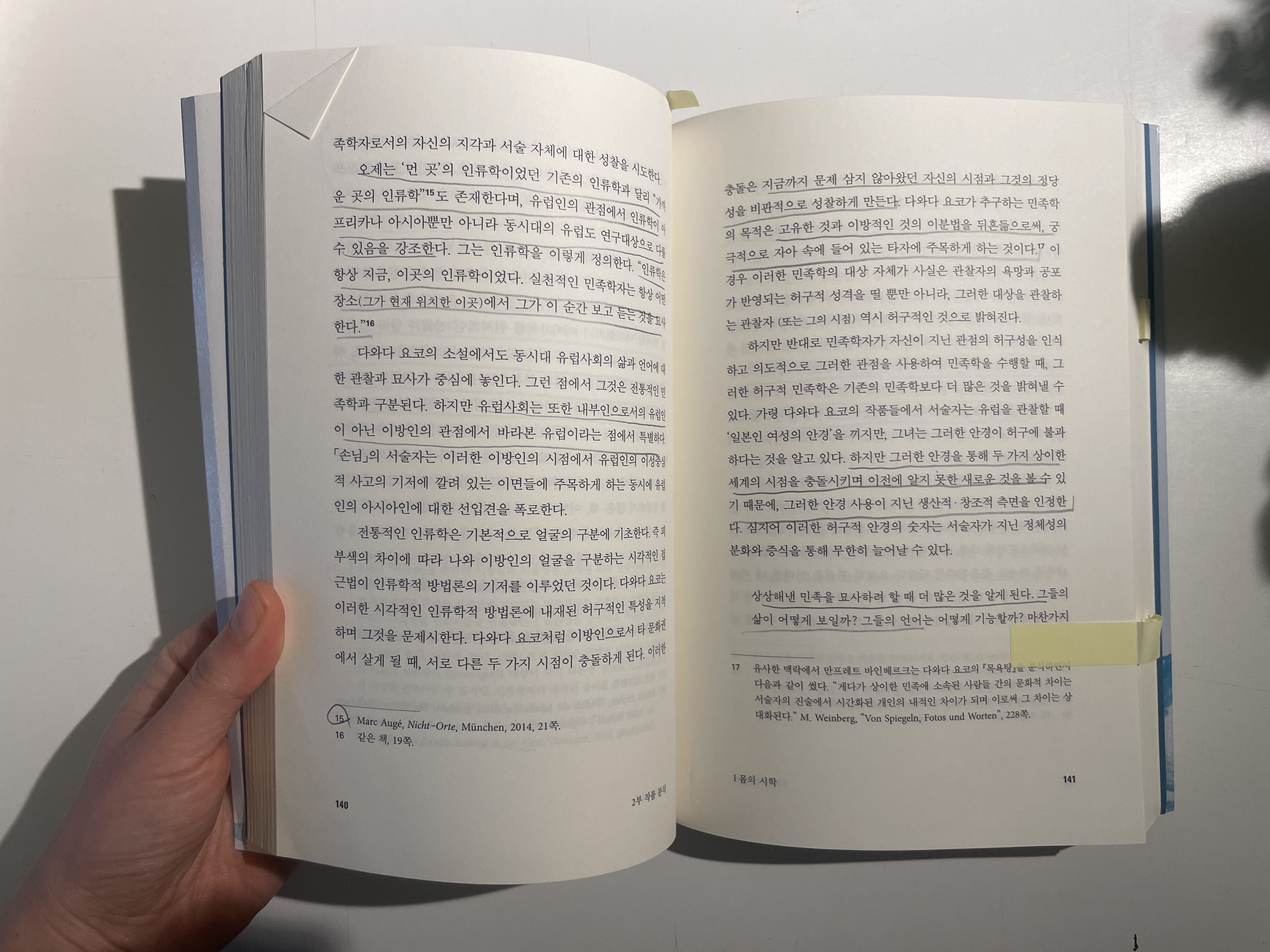 포스트모던 인류학과의 접점, 즉 타자에 대한 민족지를 쓰는 자기 자신을 분석 대상으로 삼는 자기준거성은 이 책에서 다와다를 읽는 하나의 핵심 열쇠가 된다. 민족지적 글쓰기의 윤리나 방법을 논하는 책들이 종종 ‘관찰자의 위치’를 문제 삼아왔듯, 다와다는 관찰이 언제나 위치와 몸을 가진다는 사실을 텍스트 내부에서 드러낸다. 정항균은 이것을 문학의 기술로만 두지 않고, 민족학적 시선 자체를 갱신하는 실험으로 끌어올린다.