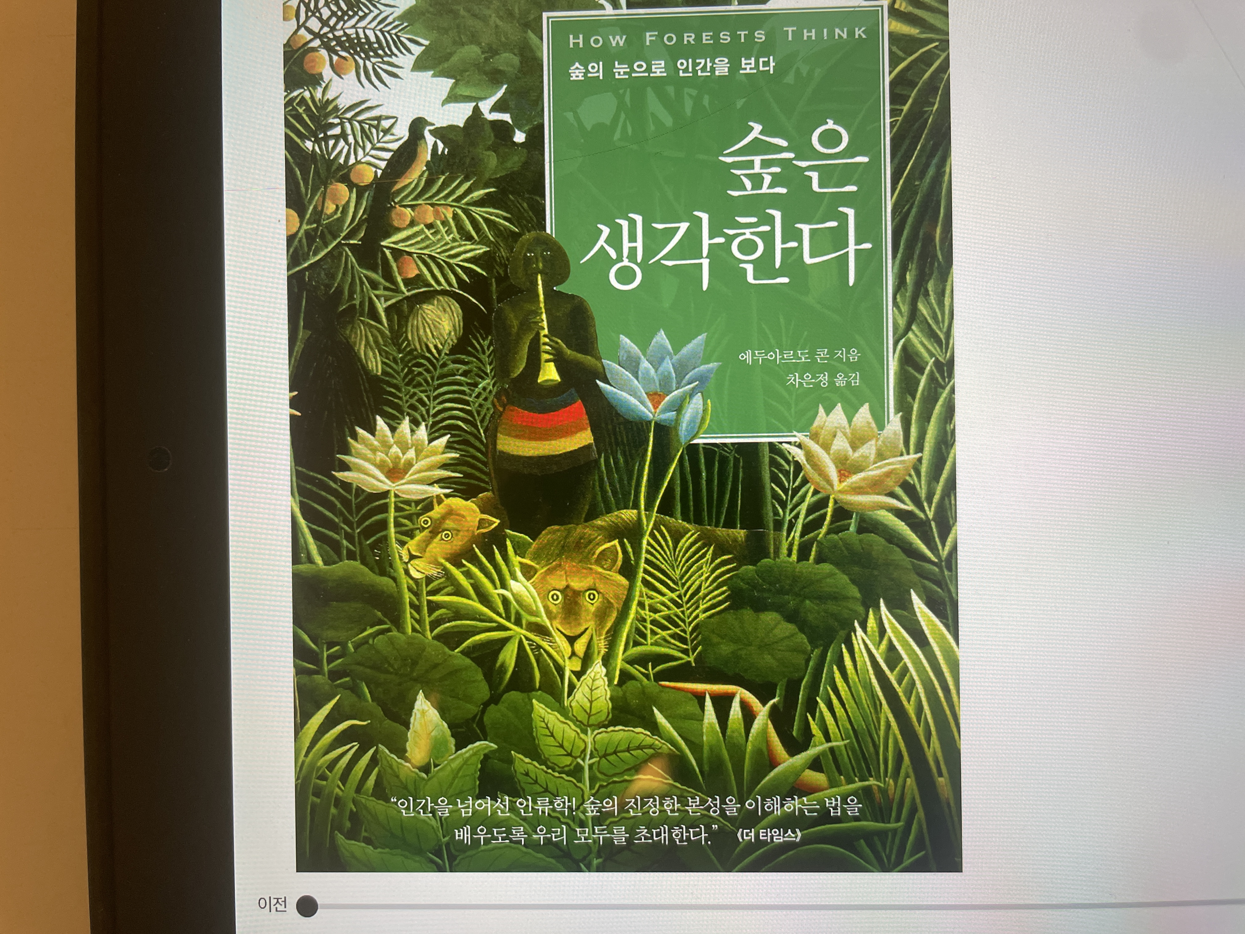저자 에두아르도 콘은 에콰도르 상부 아마존(Upper Amazon) 지역에서 루나(Runa) 사람들과 함께 보낸 현장연구를 바탕으로 이 이야기를 직조한다. 숲에서의 사냥, 꿈, 추적, 우연처럼 보이는 징후들이 어떻게 의미가 되는지. 인간의 언어가 닿지 않는 곳에서도, 삶은 이미 ‘기호를 읽는’ 방식으로 굴러가고 있음을 보여준다. ‘생각’은 인간의 머릿속에서만 일어나는 활동이 아니라, 살아남기 위해 세계를 표상하고 예감하고 계산하는 관계적 작동으로 확장된다.
